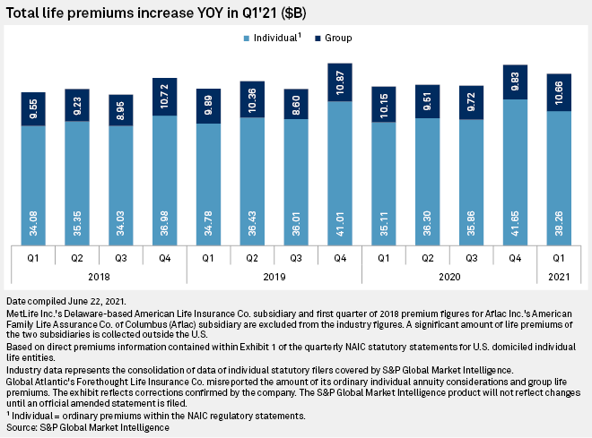 The life insurance market logged $48.93 billion in total life premiums in the first quarter, an 8.1% increase from $45.26 billion in the prior-year quarter, an S&P Global Market Intelligence analysis showed.